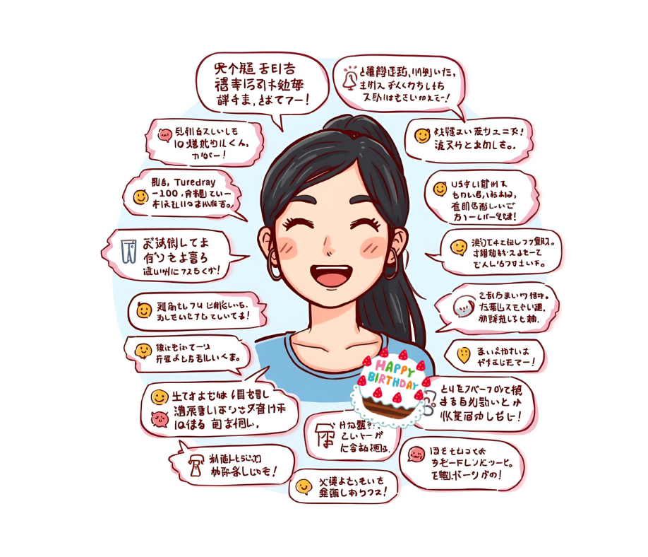 AIに「SNSの誕生日お祝いメッセージをいただいて喜んでいる私(ポニーテールの女性)のイラストを作ってください。メッセージは吹き出しで」とプロンプトを入れたら、こんなイラストを作ってくれました(^^)。メッセージは読めない変な文字&文章?になっていて面白いですね(笑)。