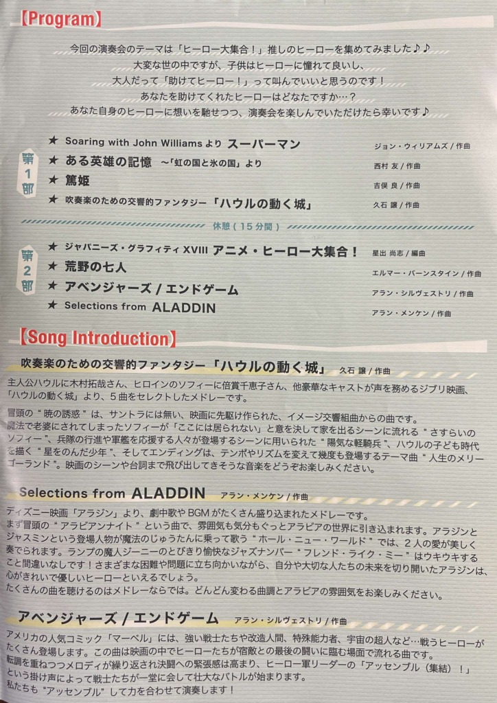今回のテーマは「ヒーロー大集合」。スーパーマンやアニメのヒーローたち(アトム、ガッチャマン、ゲゲゲの鬼太郎など)、映画『ハウルの動く城』や『荒野の七人』、そして『アラジン』など、耳馴染みのある名曲がたっぷりで、演奏も迫力満点で素晴らしかったです!