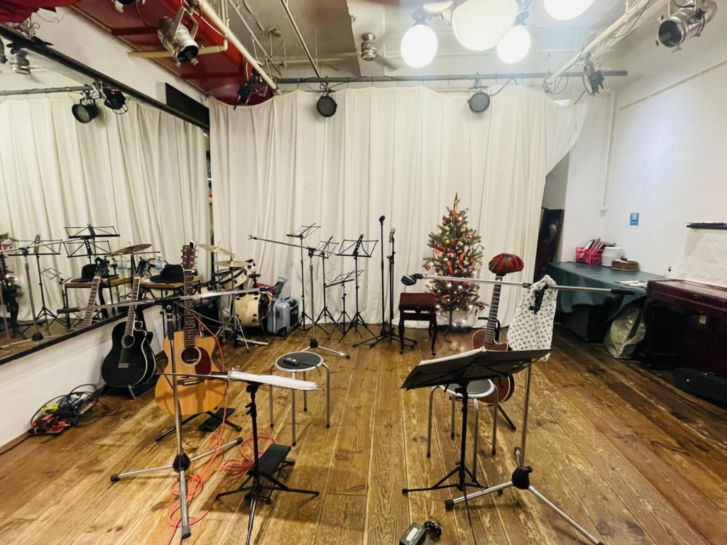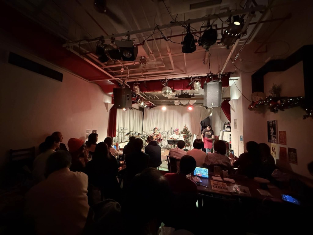 客席後方から撮っていただいた写真には、ステージ上手で料理を運ぶスタッフさんの姿がちらり。ステージの奥にキッチンがあり、上手側が動線なんです。そして、ステージにはクリスマスツリーも。そんなライブ空間も含めて、とても味わい深い夜になりました。