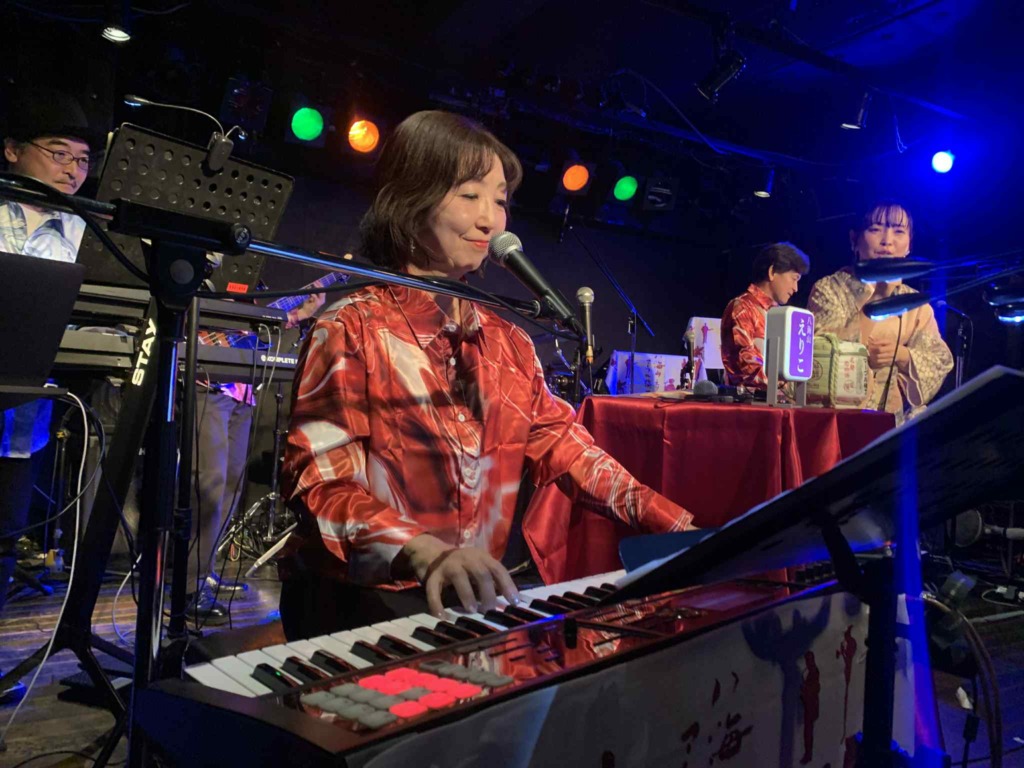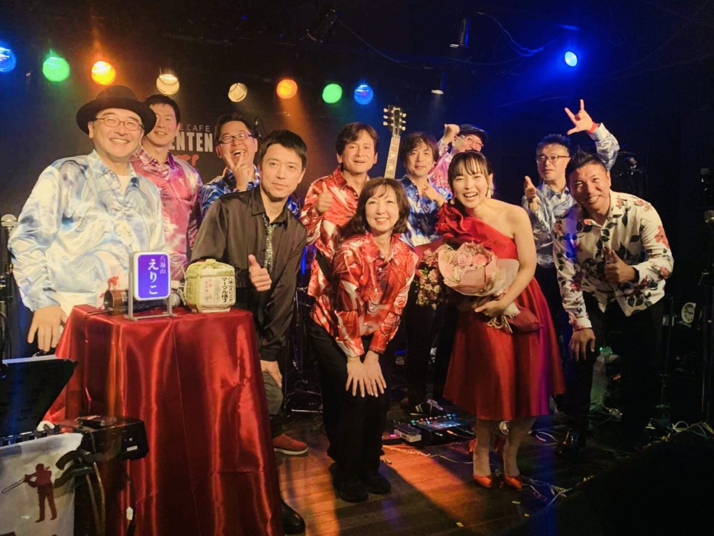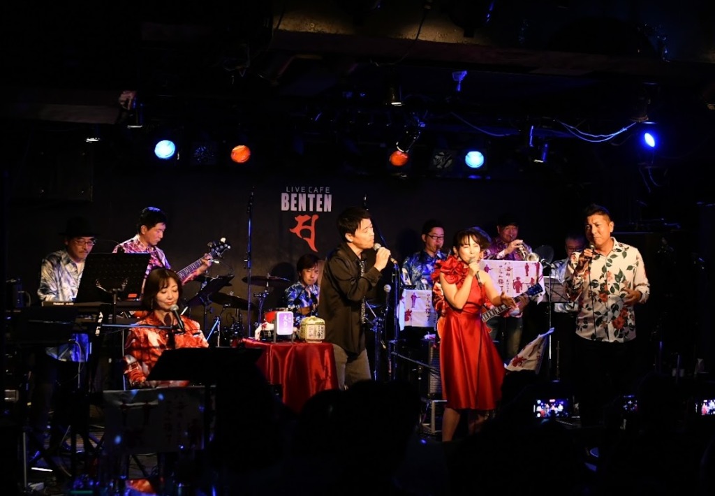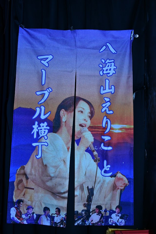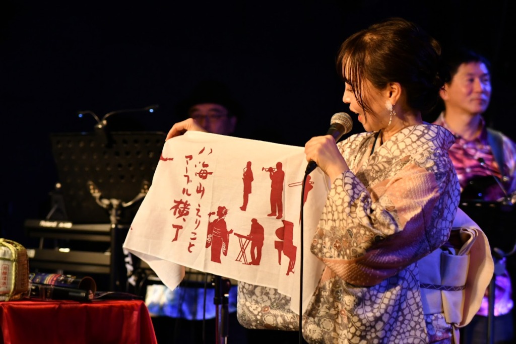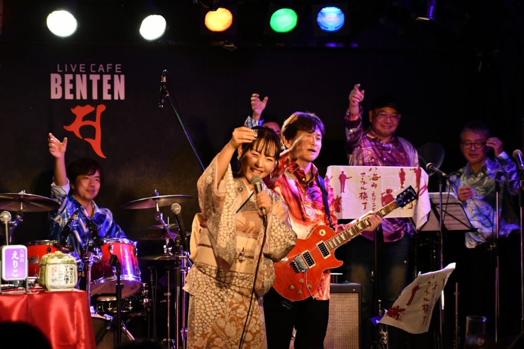 昨年好評だったオリジナル手拭いは、今年はエンジ色を新調。メンバーは全員、マーブル模様のシャツで揃えてステージへ。“マーブル横丁”の名をそのまま音と色に落とし込んだような装いでした(^^)。