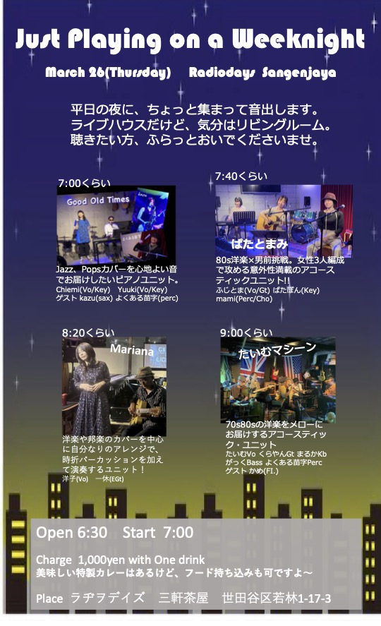 3月26日(木) 三軒茶屋ラヂオデイズ。4つのユニットが集まって、わいわいと音出します。
